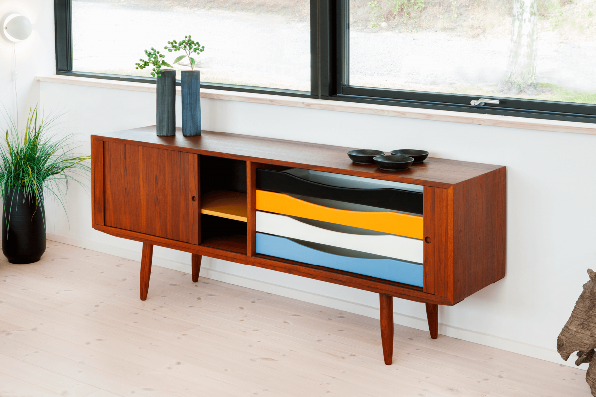 En stue eller spisestue kan sagtens blive et praktisk opbevaringsrum, uden at det føles sådan. Det handler om indpakningen, og med en smuk skænk får du masser af opbevaringsplads, uden at rummet føles rodet. Skænken James udføres i teakfiner med jalousilåger og dertil malede skuffer og hylder. Skuffer og hylderne kan flyttes rundt efter behov – på en måde får du et smukt møbel som tilpasser sig dine behov og personlige stil.